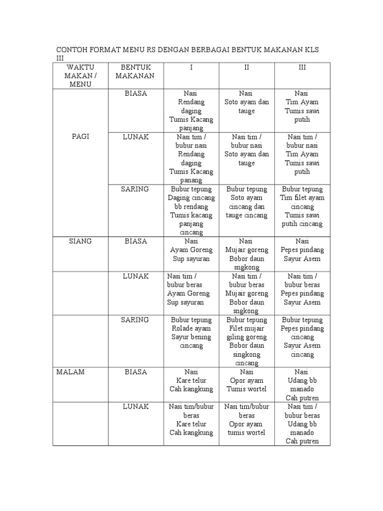 Contoh menu dan resep bentuk makanan standar rumah sakit. 10 A SIKLUS MENU MAKANAN RUMAH SAKIT WAKTU KELAS BENTU I II III K BIASA Nasi Nasi Nasi Perkedel Ayam Sambal daging bumbu bali goreng hati Sup wortel Tumis sapi buncis kangkung Tumis labu siam III LUNAK Nasi tim Nasi tim Nasi tim Loaf daging Semur Bola-bola hati Cah wortel ayam sapi buncis cincang Stup labu Cah siam kangkung SARING Bubur tp Bubur beras Bubur. Bubur adalah jenis makanan lunak yang umumnya menggunakan beras sebagai bahan utama.