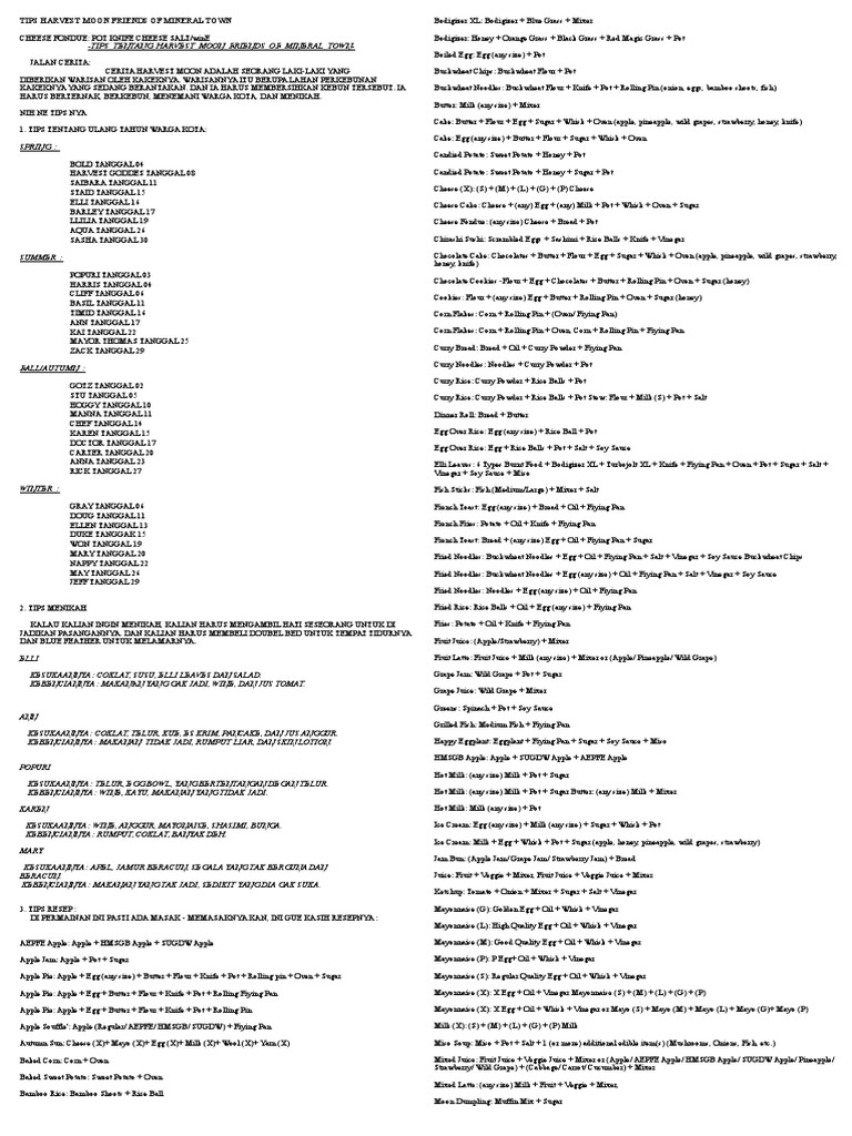 Demi memenuhi permintaan teman-teman yang masih suka game jadul Harvest Moon Friends of Mineral Town versi GBAPS1 ini berikut saya berikan resep total 108 masakan yang bisa anda masak di game Harvest Moon ini. A 1Apple Jam Selai Apel Bahan. Back To Nature semoga dapat bermanfaat bagi pembaca.